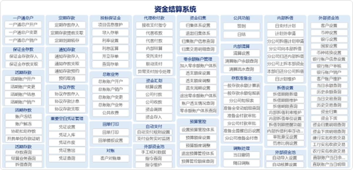 资金结算系统旨在通过网银、财企直连、银企互联、柜面等多种渠道为客户以及自身提供资金集中、资金收付、资金清算、现金池信息维护、现金池管理、现金池资金运营、电子出纳等金融服务。